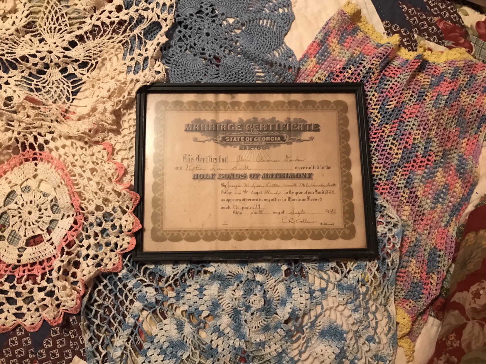 This is my great-grandmother, Mama Katie,’s marriage license to my great-grandfather, Alvin. This marriage license is from Bartow County in March 22nd 1930. And these are doilies that she made.