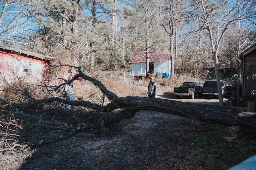 This is right after the tree was cut down. Tony is inspecting it, while Daddy is cutting it up into movable pieces.