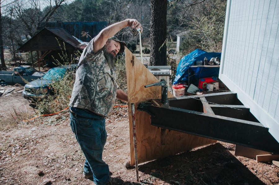 Daddy seeing if this piece of scrap will be long enough to cover the window.
